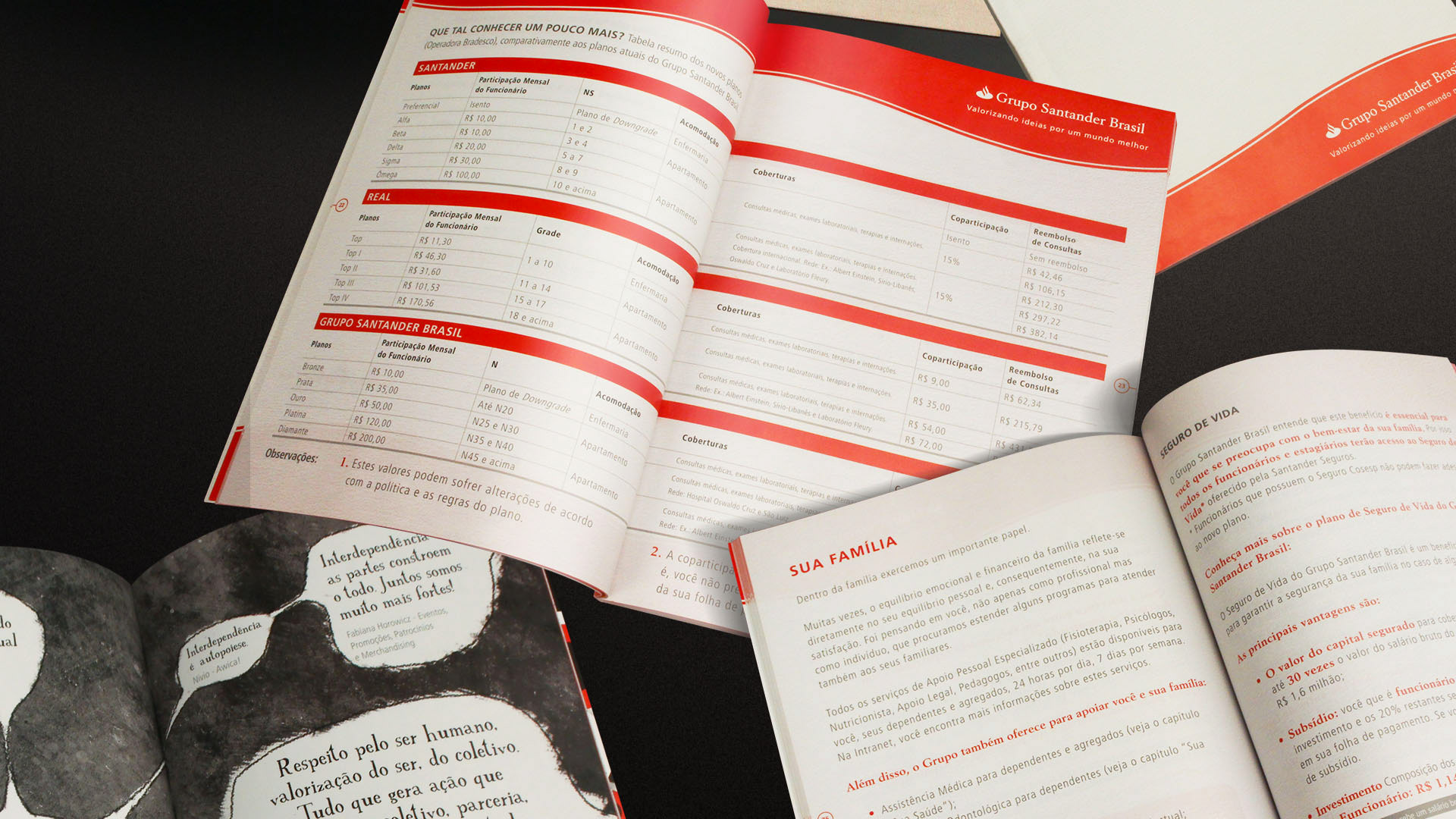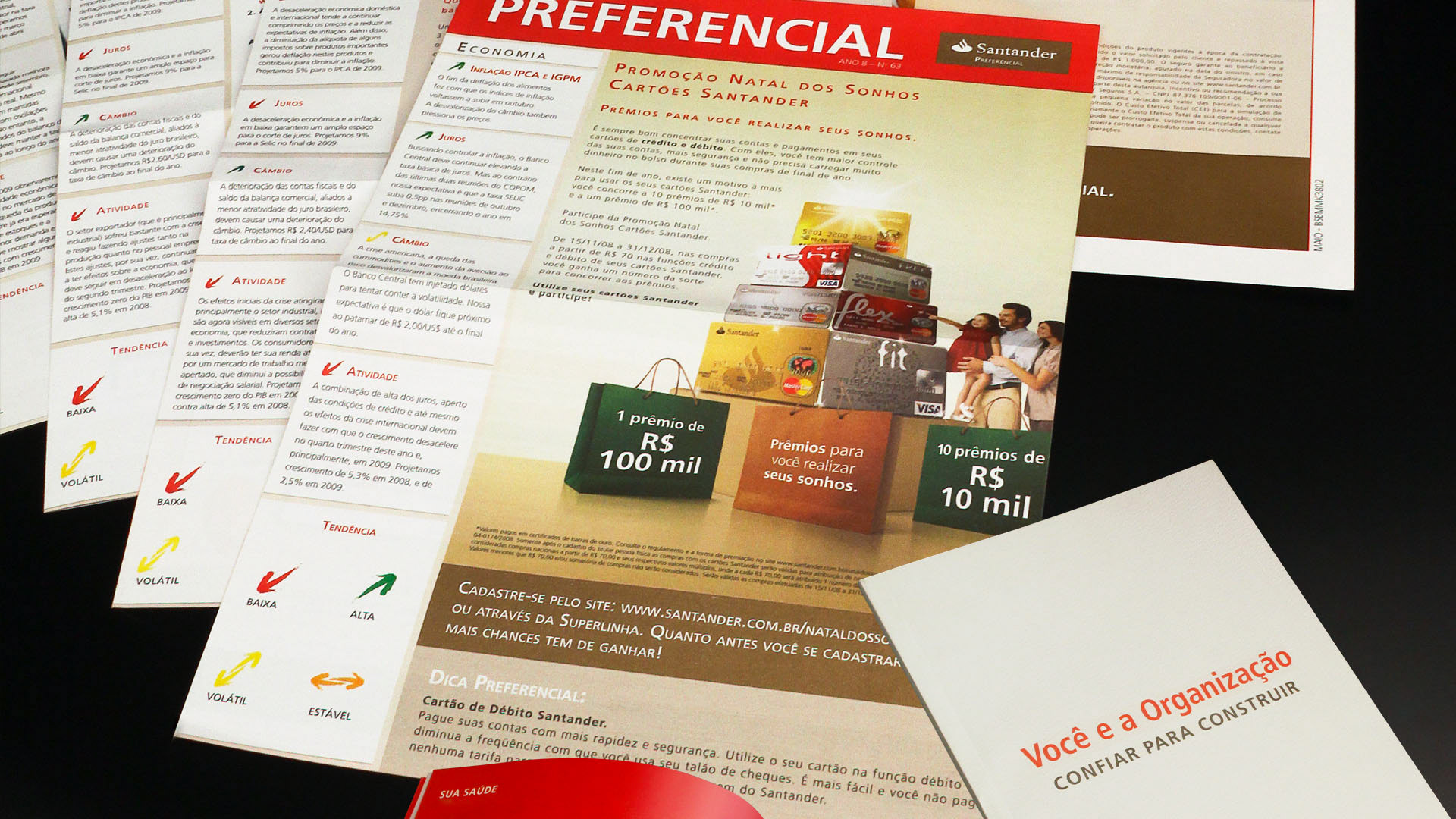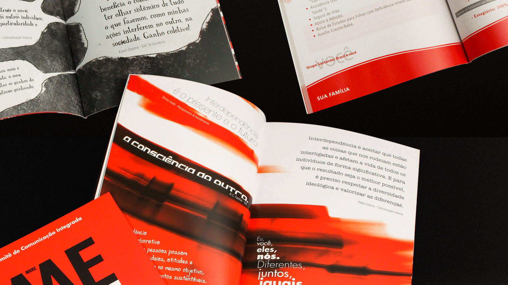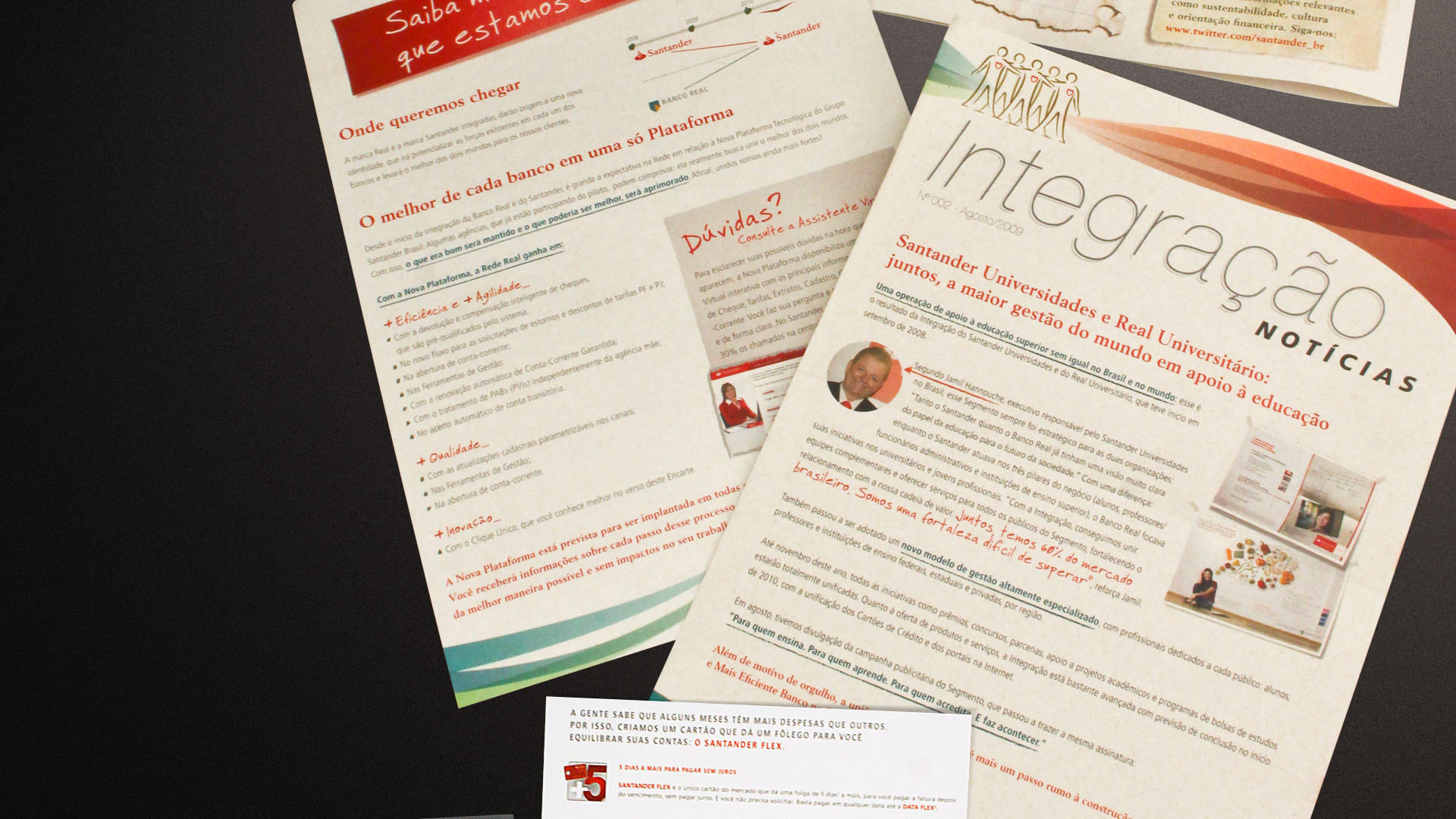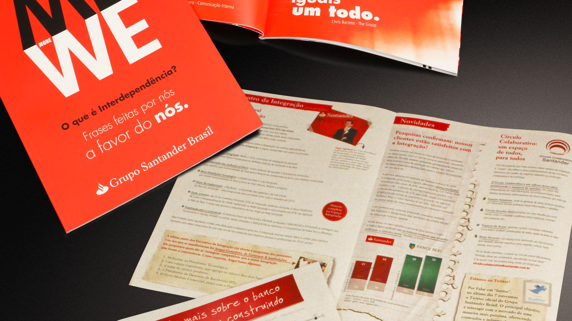 Peças de relacionamento - interno, consumidor e mercado - para o banco Santander. Destaque para toda a comunicação interna durante a fusão com o banco Real
